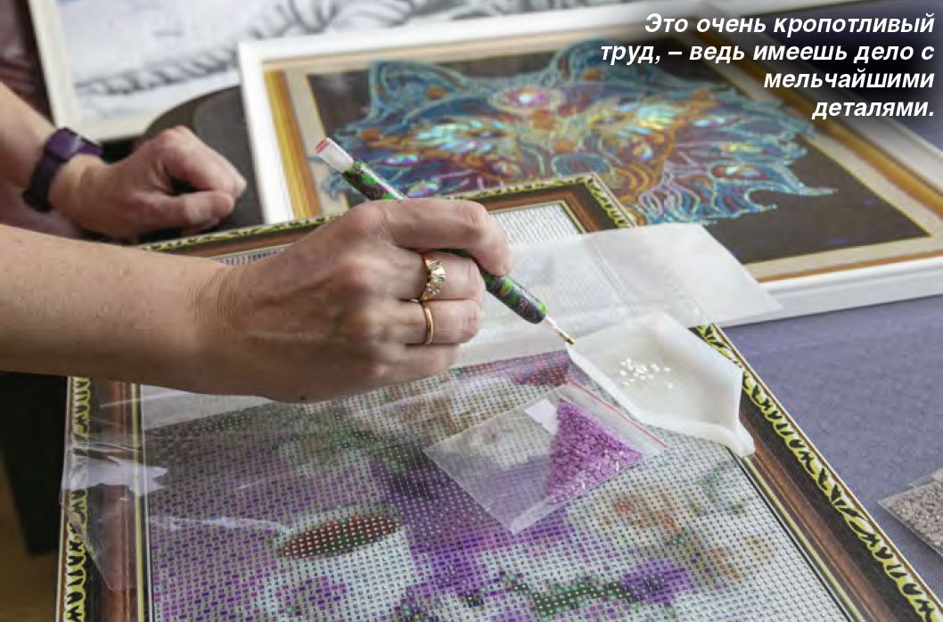 – Если честно, я сама толком не знаю, почему именно «алмазная». Возможно, из-за того, что мастерами используются стразы и специальные «камушки», которые нужно приклеивать к основе. Это, по сути, те же стразы. Иногда они блестят – на солнце или при особом освещении, – невольно создавая ассоциацию с алмазами. Они бывают двух типов: для полной выкладки (когда стразами покрывается вся картина) или для частичной (когда стразами выкладывается только само изображение какого-то героя или предмета, например, чей-то портрет).
