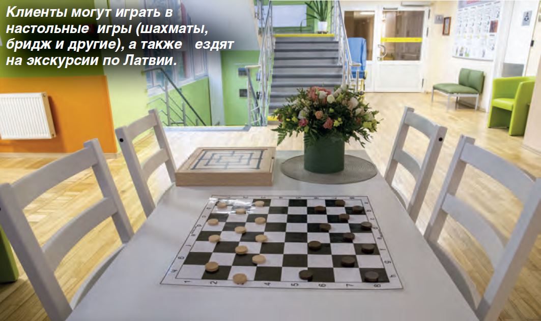И все же мы нашли выход: наши клиенты имеют возможность раз в неделю самостоятельно готовить под руководством сотрудников. Могут играть в настольные игры (шахматы, бридж и другие), также мы возим их на экскурсии по Латвии.